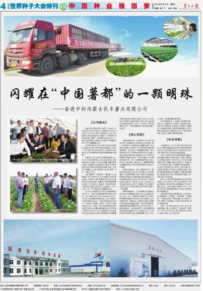 2014年5月27日,農(nóng)民日報世界種子大會特刊以 “中國種業(yè)強國夢” 為主題刊登了《閃耀在“中國薯都”的一顆明珠——奮進中的民豐薯業(yè)有限公司》一文。